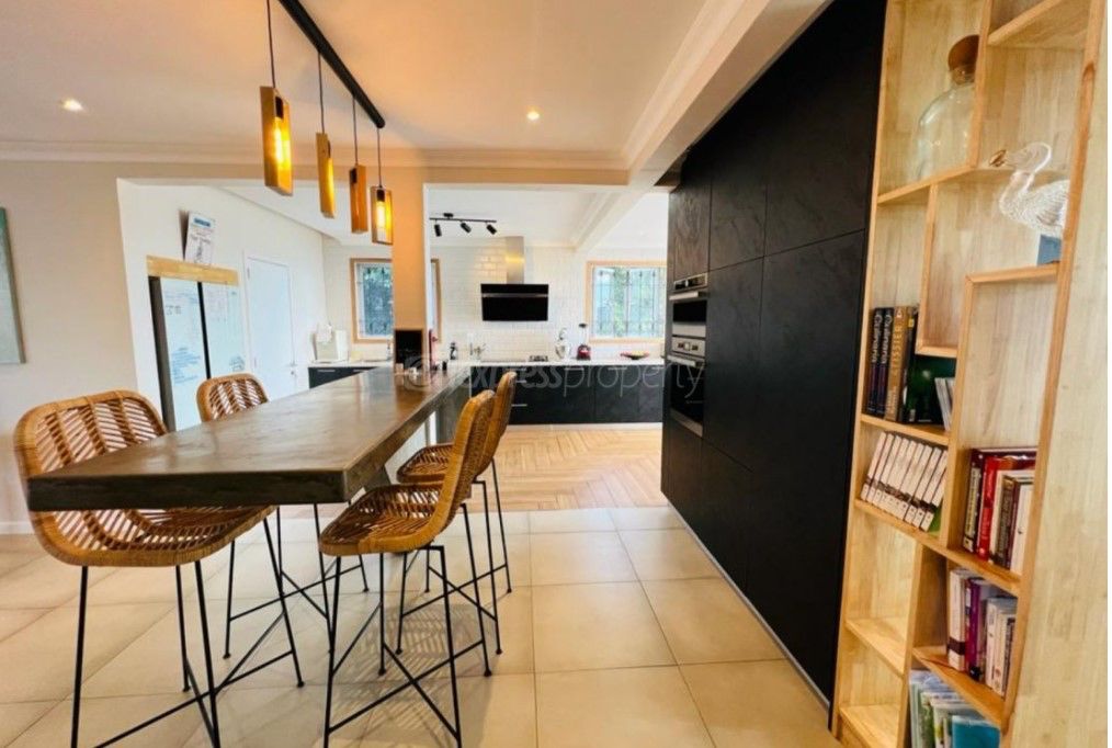 La cuisine entièrement équipée s’ouvre sur la piscine et communique avec un bar à chaises hautes, une salle à manger élégante et un salon confortable avec canapé d’angle donnant sur la terrasse.